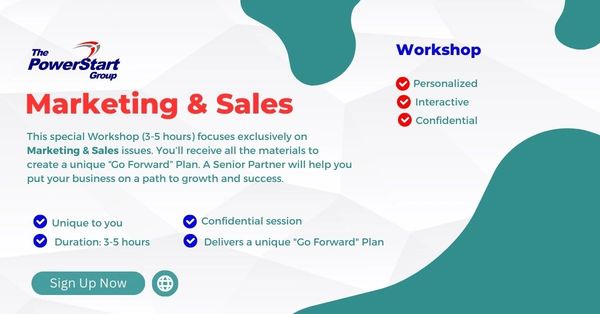 This PowerStart Business Growth Workshop focuses on Marketing & Sales issues & strategies you’ll need to be successful. Available to you and your Executive Team, up to 6 people. You’ll be guided by a PowerStart senior partner. Time commitment: 3-5 hours.